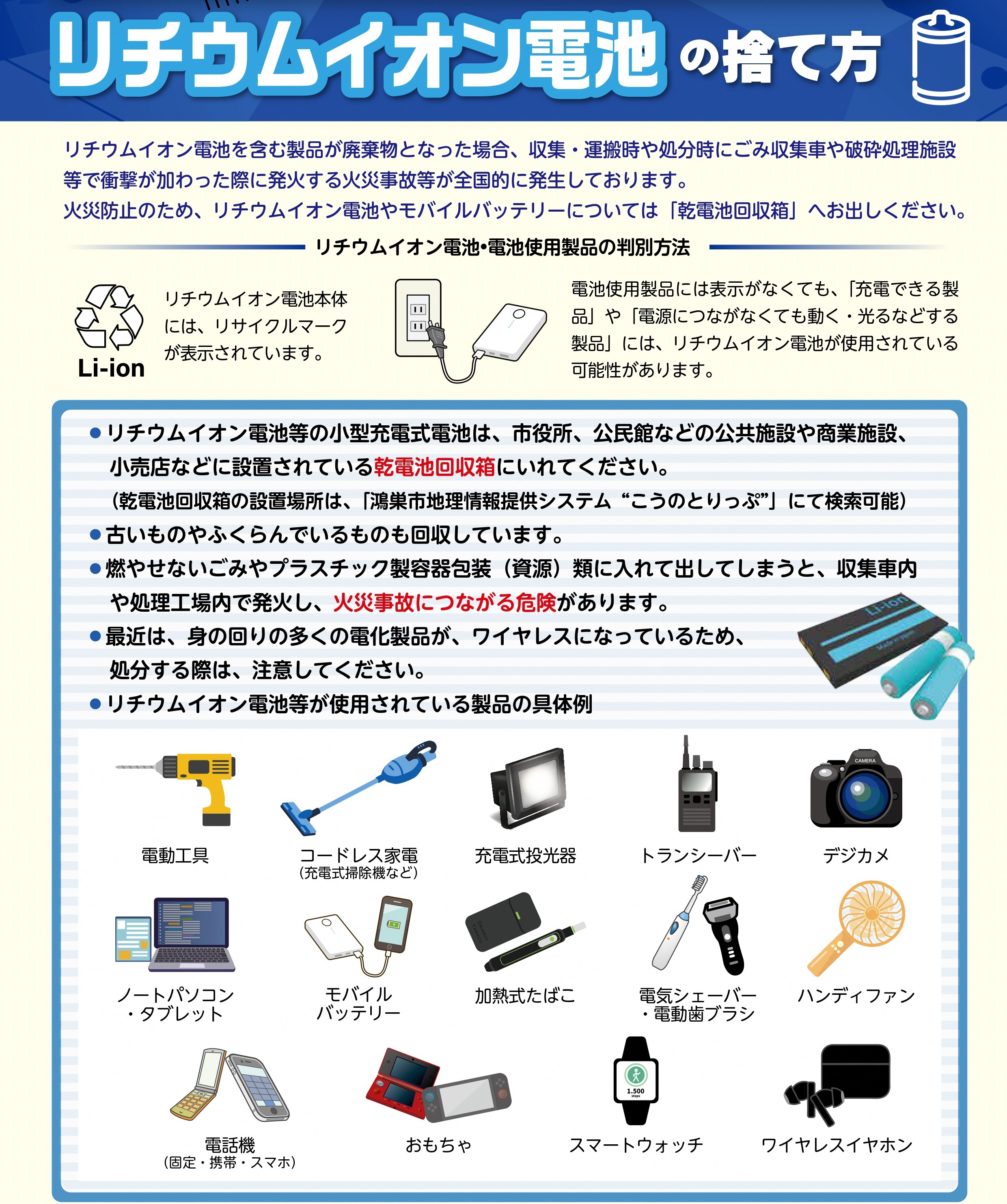 鴻巣市でも、リチウムイオン電池等を原因とした収集車の火災が発生しています。火災が発生すると、廃棄物処理施設や収集車が使用不能となり、皆さんの生活に大きな影響を及ぼすこととなるだけではなく、収集作業員の命にもかかわります。処分方法を守って排出するようお願いします。